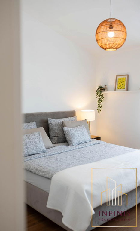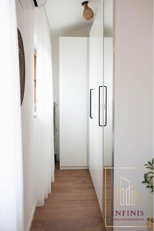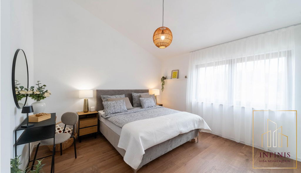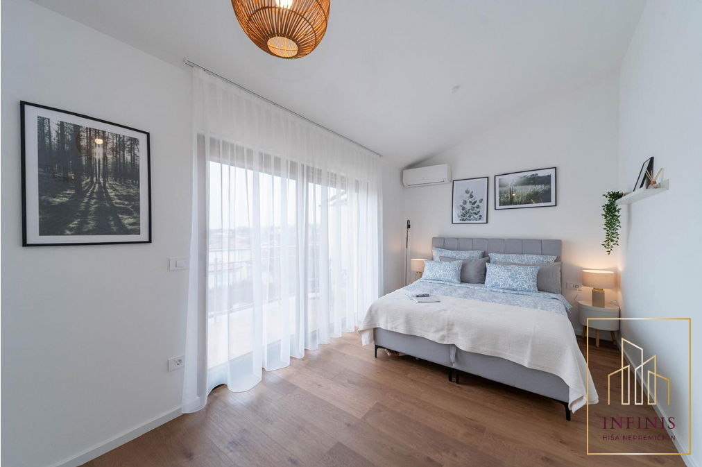 Spalnice imajo visoke strope, kar prostoru daje občutek razkošja in dodatne zračnosti. V nadstropju je tudi druga kopalnica, moderno urejena, s prostornim tušem in kakovostno sanitarno opremo.