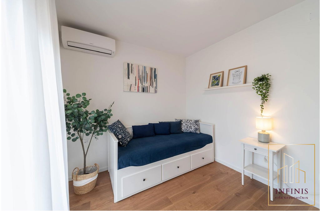 V pritličju je tudi ena spalnica z raztegljivim ležiščem, ki prav tako ima izhod na teraso. Ta soba lahko služi kot soba za goste, delovni prostor ali spalnica za družinske člane, ki želijo bivati v pritličju.