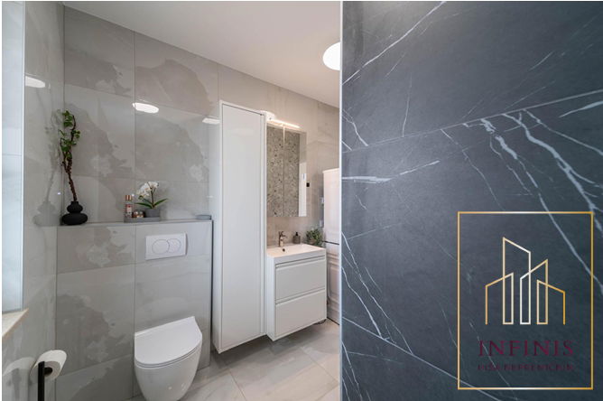 Pritličje vključuje tudi kopalnico z modernim tušem, opremljeno s pralnim in sušilnim strojem – praktično za vsakdanje življenje.