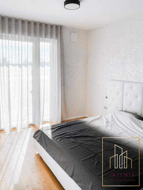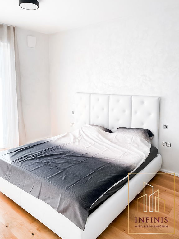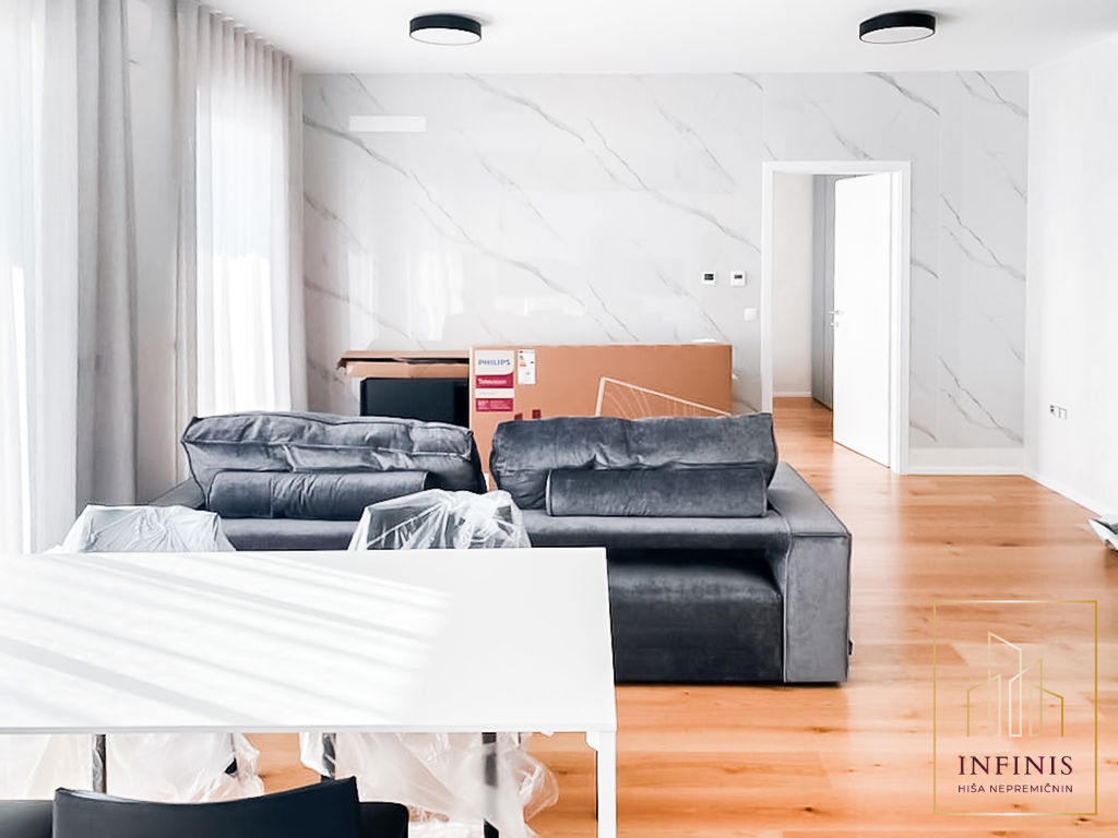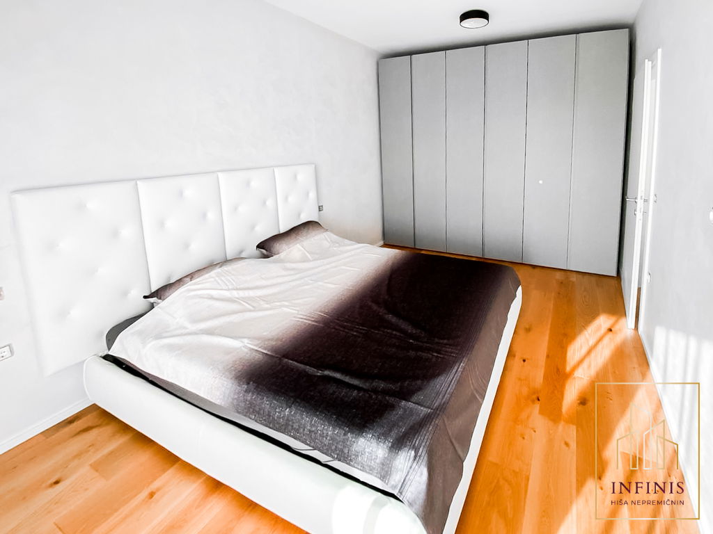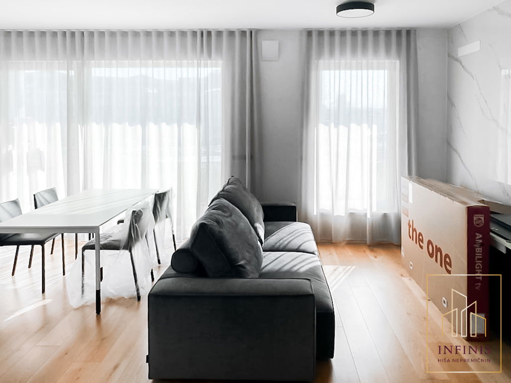 Prostor zaznamujejo visoki stropi, jugovzhodna lega in premišljena arhitekturna zasnova. Vgrajeno je talno gretje, široko-lamelni hrastov parket, troslojna okna z električnim upravljanjem žaluzij, sistem rekuperacije, klimatska naprava in video domofon. Vsa oprema je izdelana po meri, gospodinjski aparati pa so blagovne znamke Bosch. Razporeditev vključuje predsobo z vgradnimi omarami, kopalnico, kabinet brez okna, spalnico z izhodom na prostorno teraso (18,4 m2) ter večji dnevno-bivalni prostor s kuhinjo in jedilnico, ki prav tako vodi na teraso.
