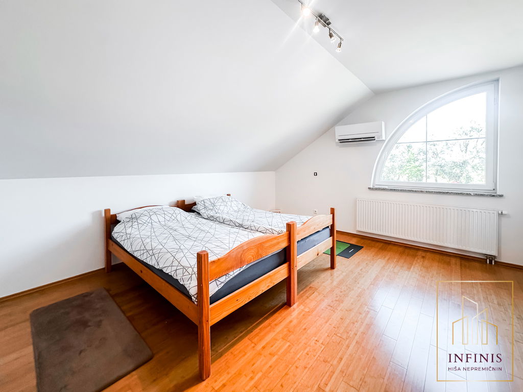 Razporeditev prostorov vključuje pritličje, prvo nadstropje in mansardo. V mansardi se nahaja glavna spalnica, pisarna z garderobo, kopalnica, ločen WC ter dve otroški sobi. V prvem nadstropju je odprt dnevno-bivalni prostor s kuhinjo in jedilnico, velika dodatna soba ter veliko steklenih površin ter kopalnica. V pritličju se nahajajo pisarna, fitnes, delavnica z napeljavo za vodo, utility, rekuperacija ter manjša garaža.