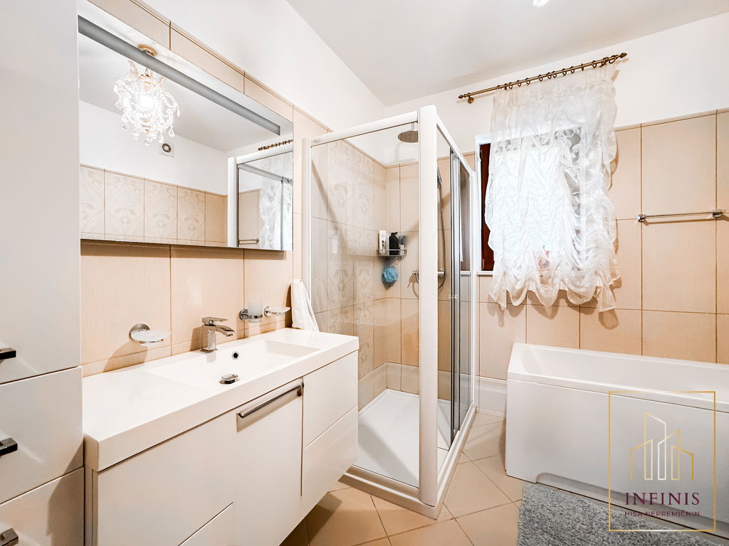 V pritličju se nahaja predsoba z jedilnim delom, ločeno stanovanje z dnevnim prostorom, dvema spalnicama in kopalnico ter izhodom na prostorno teraso z zasebnim wellnessom, ki vključuje savno in tuš. Dodatno sta v tem delu še ločena kuhinja in WC. V nadstropju sta urejeni dve samostojni trisobni stanovanji, vsako s svojo kuhinjo, dnevnim prostorom, dvema spalnicama, kopalnico in balkonom. Eno izmed stanovanj ima tudi veliko teraso z vgrajenim jacuzzijem.