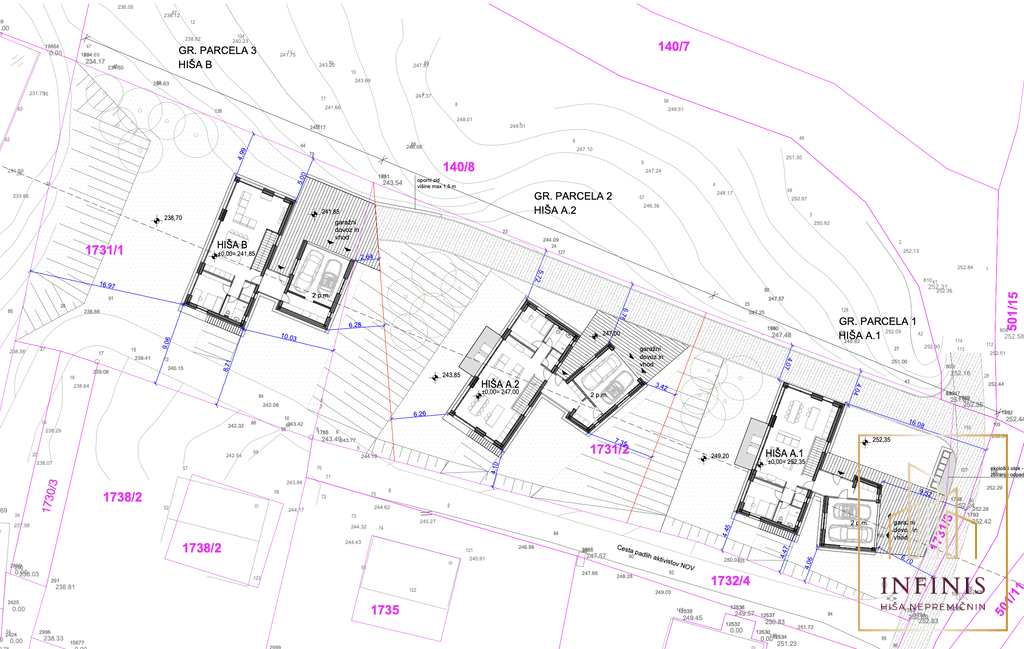 Na pobočju smo zasnovali tri hiše z razgledom nad Rogaško Slatino. Teren je razgiban, zato je vsaka hiša drugačna in umeščena tako, da omogoča lepe razglede iz bivalnih prostorov na pobočje na drugi strani doline. Vsi stanovanjski prostori so v dveh etažah, ob hiši je garaža s servisnimi prostori. Zasnova upošteva urbanistična izhodišča občine Rogaška Slatina.