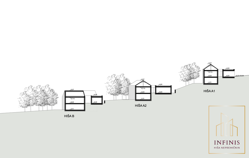 Pritličje je na koti +0,00, klet je na koti -3,15 m. Maksimalna višina objekta je na višini +5,97 m.
