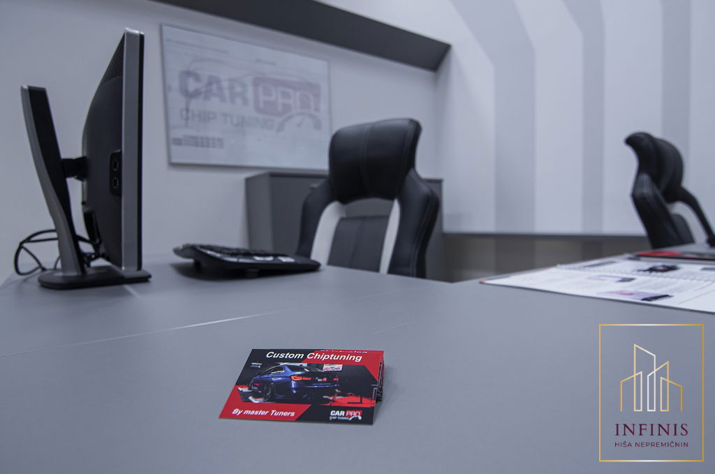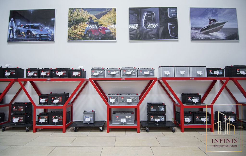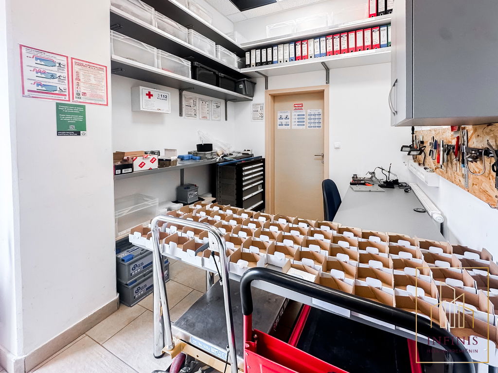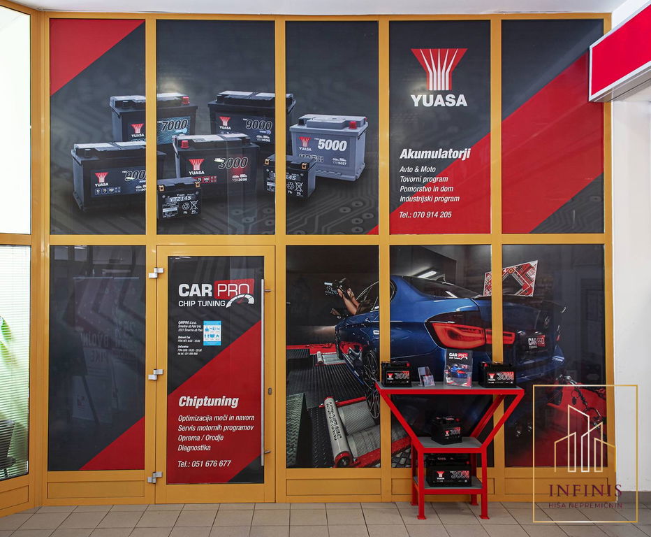 Razporeditev vključuje trgovski del, ločen pisarniški prostor, skladišče in lastne sanitarije. Strop je dovolj visok, da po potrebi omogoča izgradnjo dodatne etaže v velikosti 60 m2, kar odpira možnost povečanja uporabne površine.