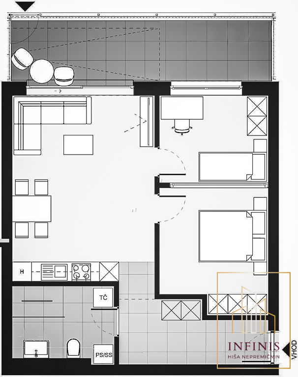Razporeditev: obsega predprostor, dnevno bivalni del s kuhinjo, jedilnico in dnevno sobo, spalnico, dodatno sobo (primerno za otroško sobo ali kabinet) ter kopalnico.