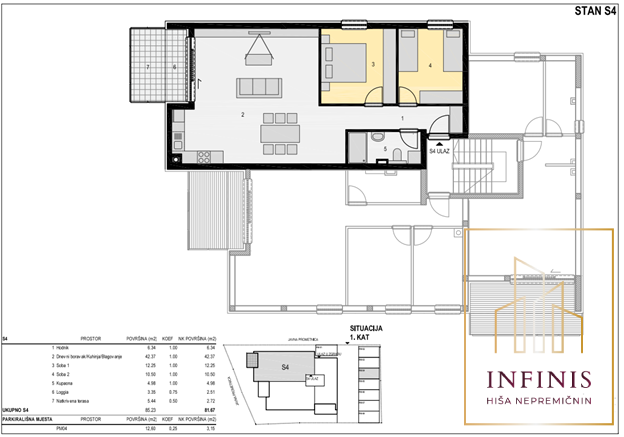 Stanovanje se nahaja v 1. nadstropju in obsega 81,67 m2 neto bivalne površine. Razporeditev je zelo prostorna in funkcionalna ter vključuje vhodni hodnik, dve prostorni spalnici, moderno kopalnico ter izjemno velik odprt dnevno-bivalni prostor s kuhinjo in jedilnico v izmeri 42,37 m2. Iz dnevnega prostora je izhod na pokrito teraso s čudovitim panoramskim pogledom na morje, ki ponuja popoln prostor za sprostitev in uživanje v mediteranskem okolju. Stanovanju pripada tudi lastniško parkirno mesto, ki je vključeno v ceno.