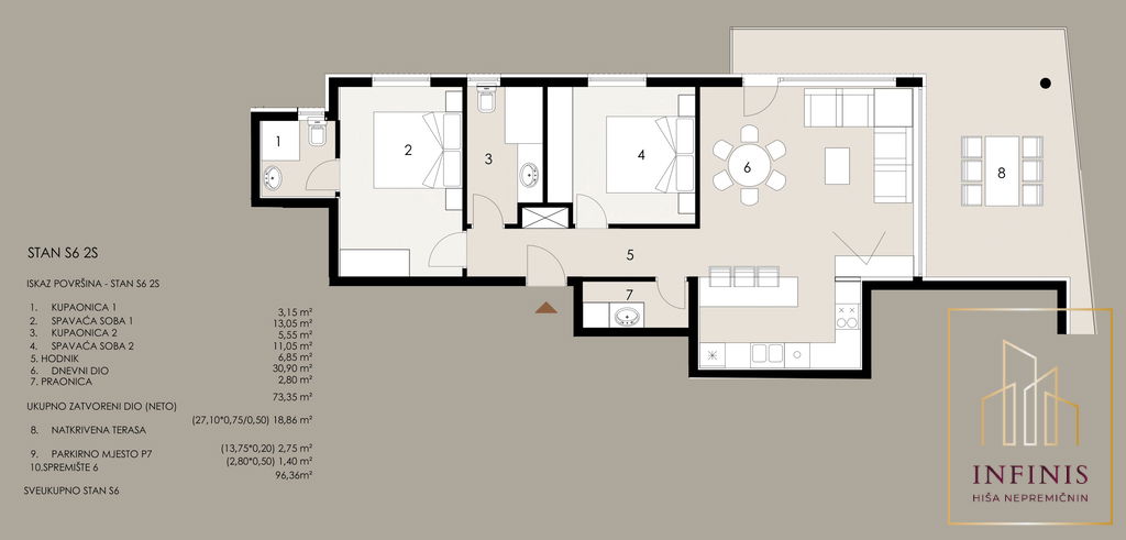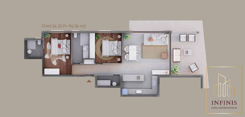 Razporeditev je izjemno funkcionalna: ob vstopu se nahaja hodnik, iz katerega dostopamo do dveh ločenih spalnic od katerih ima ena lastno kopalnico, dodatne kopalnice ter pralnice. Dnevni del predstavlja prostoren in svetel odprt bivalni prostor s kuhinjo in jedilnico. Iz dnevnega prostora je neposreden izhod na pokrito teraso, ki je idealna za obedovanje na prostem in sproščanje.