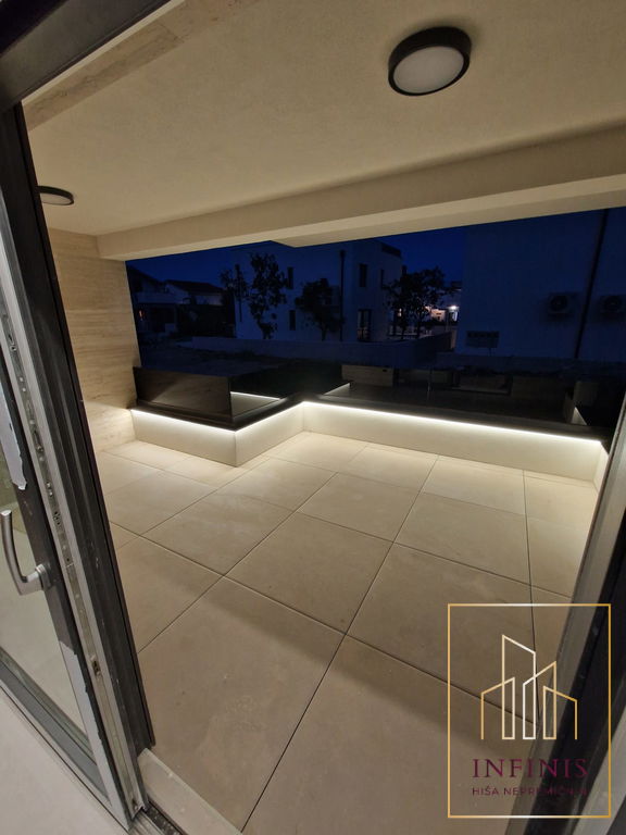 Talne obloge: Keramične ploščice dimenzij 90×90 cm v celotnem apartmaju ter na terasah, kjer so ploščice debeline 2 cm za dodatno vzdržljivost.
