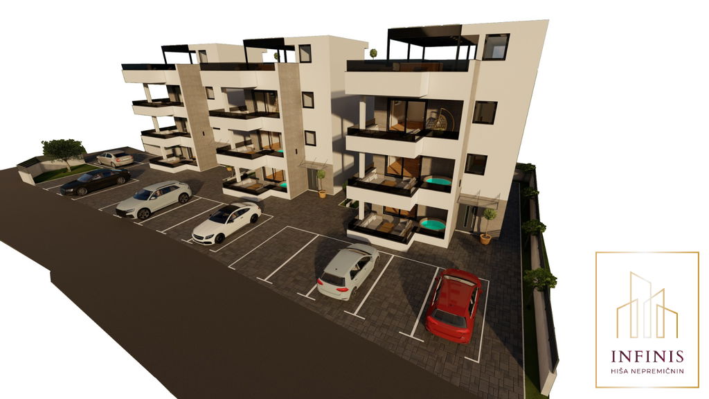 Razporeditev prostorov: Apartma obsega hodnik, tri spalnice, prostoren dnevni prostor povezan z jedilnico in kuhinjo, dve kopalnici ter prostorno teraso.
