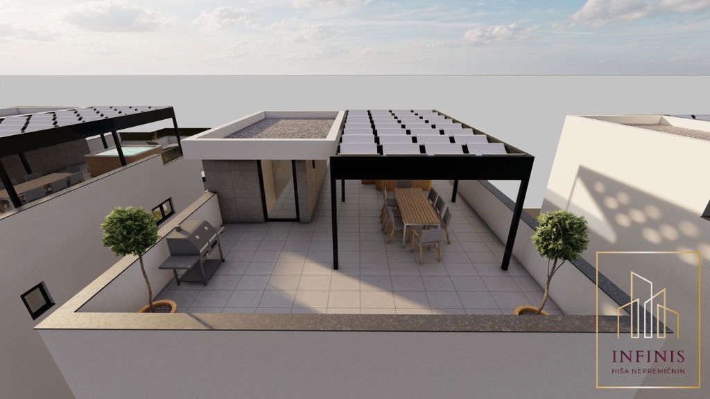 Priprava za pergolo: Na krovni terasi je priprava za pergolo, vključno z električnimi priključki in pripravljenimi nosilci za konstrukcijo, kar omogoča enostavno postavitev pergole po želji.