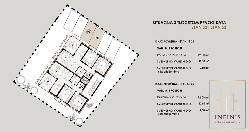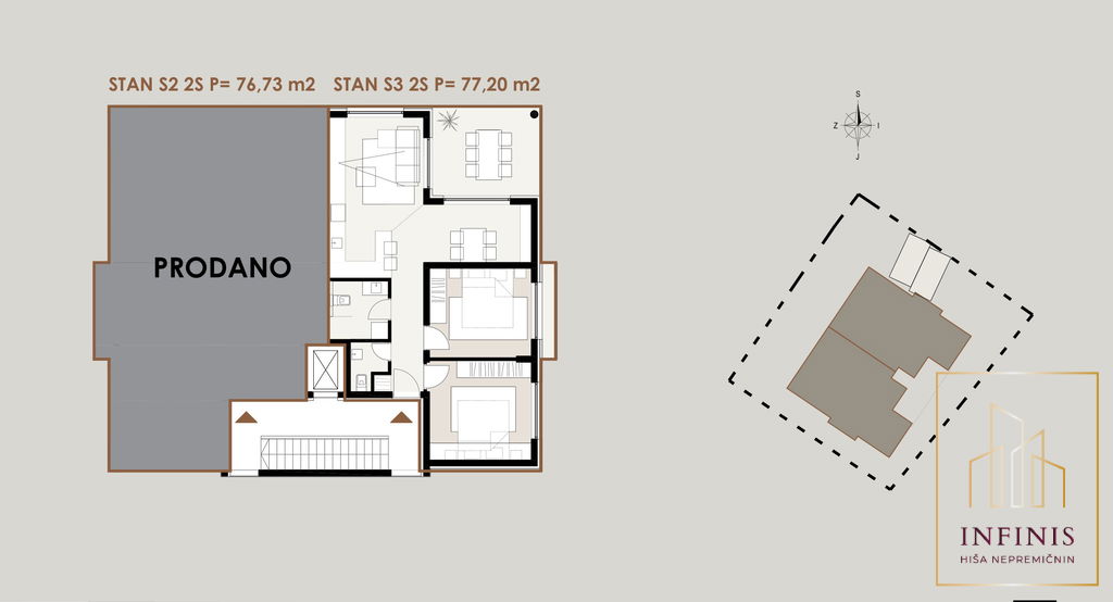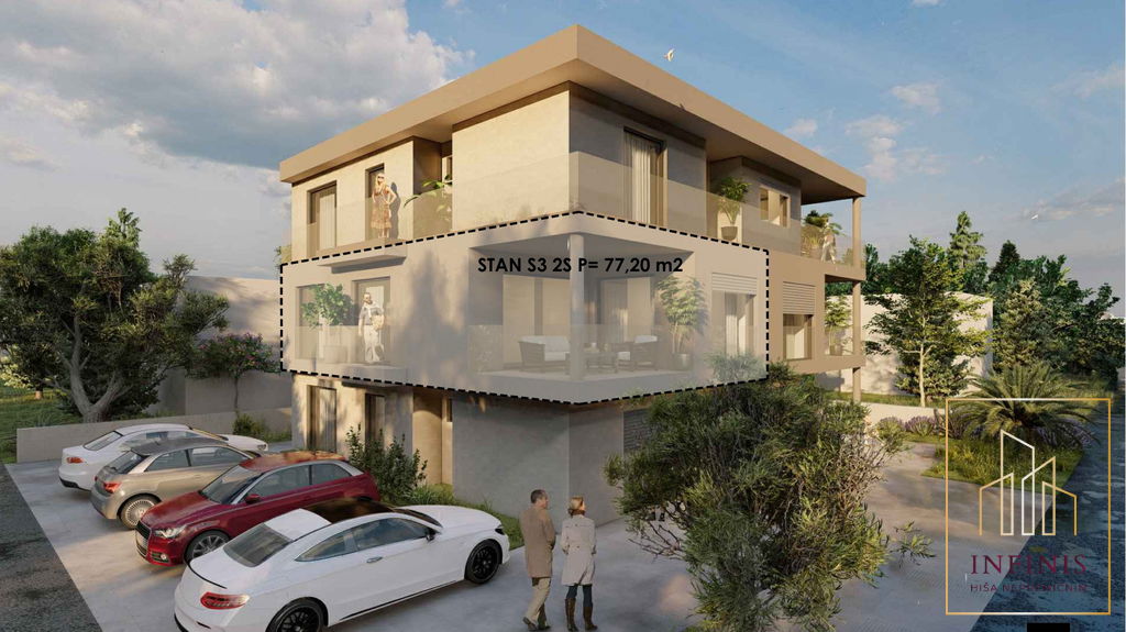 Stanovanje z oznako S3 meri 77,20 m2 neto tlorisne površine in se nahaja v 1. nadstropju sodobnega večstanovanjskega objekta. Objekt bo sodobno grajen in bo vključeval tudi dvigalo. Zaključek gradnje je predviden za julij 2027.