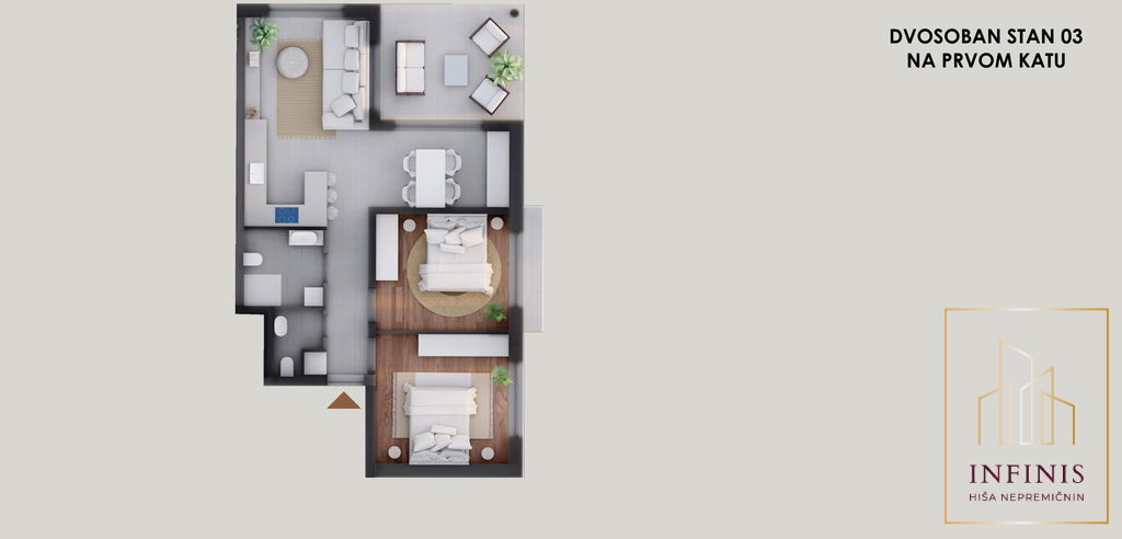 Stanovanje sestoji iz hodnika, dveh spalnic, kopalnice, dodatnega wc-ja in osrednjega dela, ki predstavlja prostoren dnevno-bivalni prostor s kuhinjo in jedilnico, z odprto in svetlo zasnovo. Iz dnevnega prostora je izhod na pokrito teraso, ki je uporabna večji del leta.