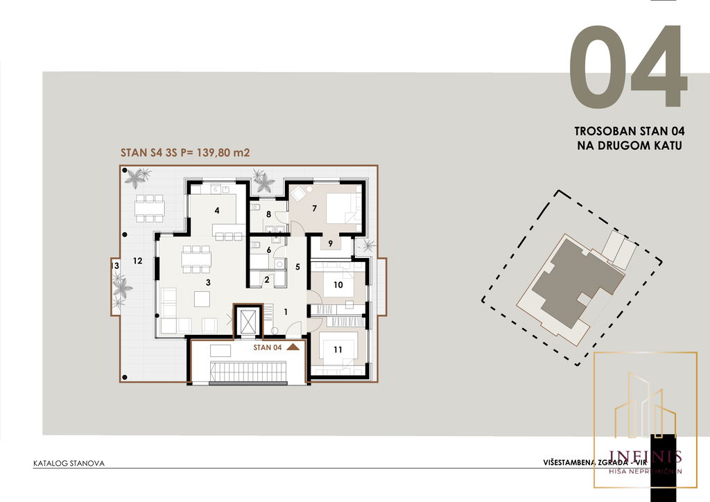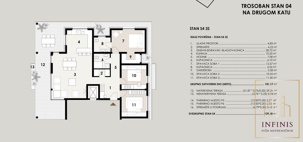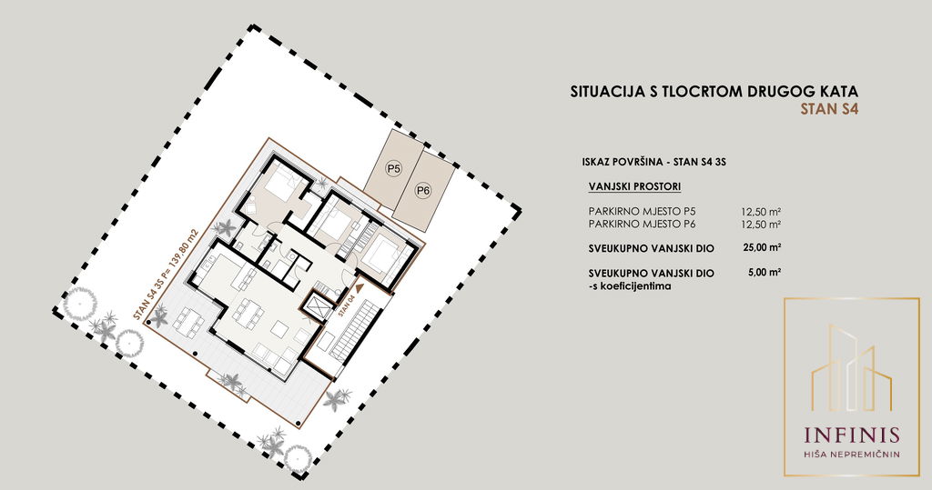 Stanovanje z oznako S4 meri 139,80 m2 neto tlorisne površine in se nahaja v 2. (zadnjem) nadstropju sodobnega večstanovanjskega objekta. Objekt bo sodobno grajen in bo vključeval tudi dvigalo. Zaključek gradnje je predviden za julij 2027.